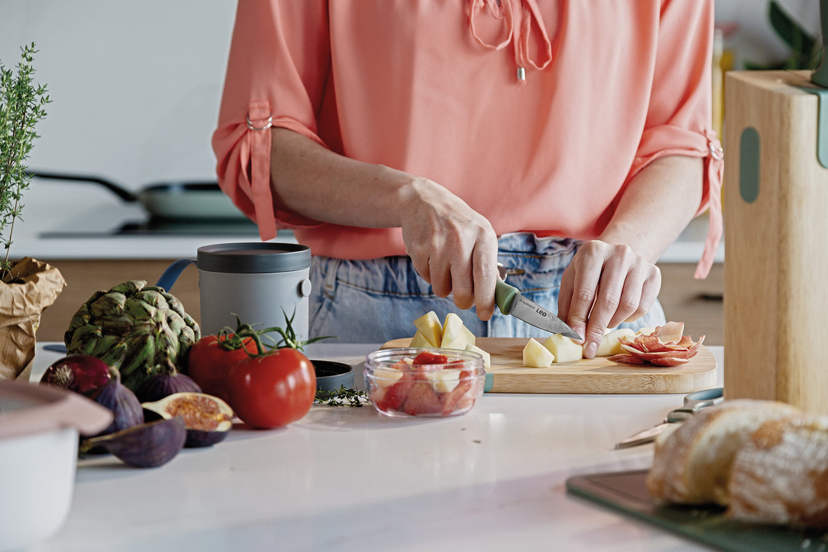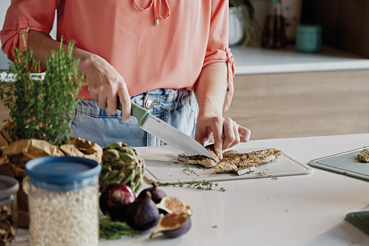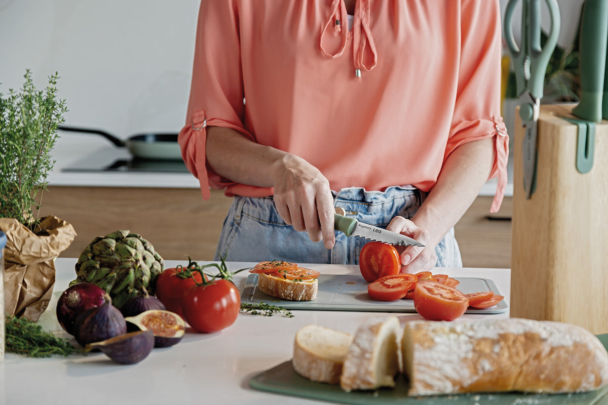 Want to jumpstart your knife collection? This 6-piece knife block with a built-in sharpener is the way to go! The versatile set includes hand-sharpened stainless steel essentials — paring, utility, carving, bread, and chef’s knives. The beautiful wooden block keeps all knives neatly organised and within reach for efficient prep, while the integrated sharpener on top helps keep edges razor sharp. Each knife features an ergonomic soft-touch handle for a comfortable, secure grip. And to complete the look, you can extend the block with matching kitchen scissors in the same Forest-green colour.