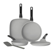 Nämä ihanteellisen kokoiset paistinpannut (20 cm ja 24 cm) auttavat sinua valmistamaan sekä aamupalan että illallisen. Upea 26 cm grillipannu on täydellinen kumppani suosikkiruokiesi paistamiseen, kun taas 24 cm lettupannu auttaa sinua loihtimaan makeita tai suolaisia herkkuja! Kierrätetystä alumiinista valmistettu runko varmistaa erinomaisen ja tasaisen lämmönjakautumisen, joka sopii erinomaisesti paistamiseen, ruskistamiseen ja nopeaan kypsentämiseen. Korkealaatuinen ja terveellinen non-stick pinnoite tarkoittaa, että tarvitset vain vähän tai ei lainkaan öljyä, ja pannu on helppo puhdistaa. Kylmäksi jäävä fenolinen kahva varmistaa, että voit siirtää pannun turvallisesti liedeltä pöytään. Pannut sopivat kaikille liesityypeille, myös induktiolle. Mukana tulee ilmainen kääntäjä, joka on valmistettu kierrätetystä muovista ja varmistaa parhaat kypsennystulokset!