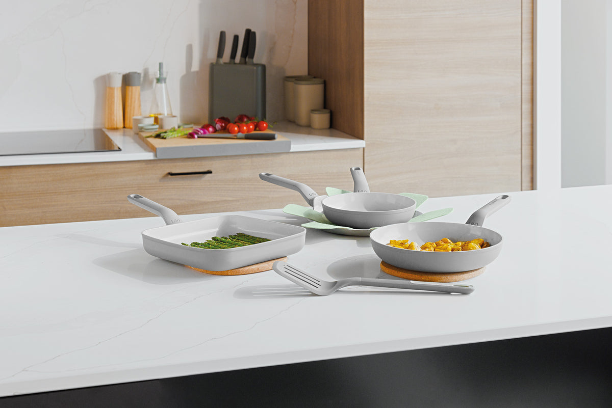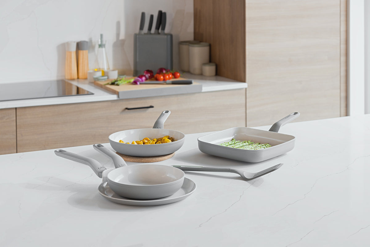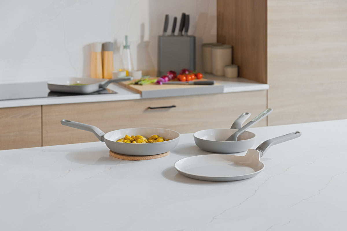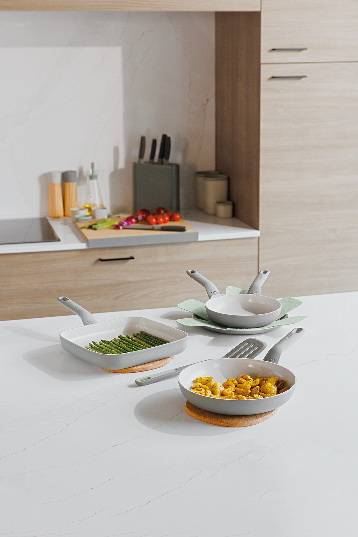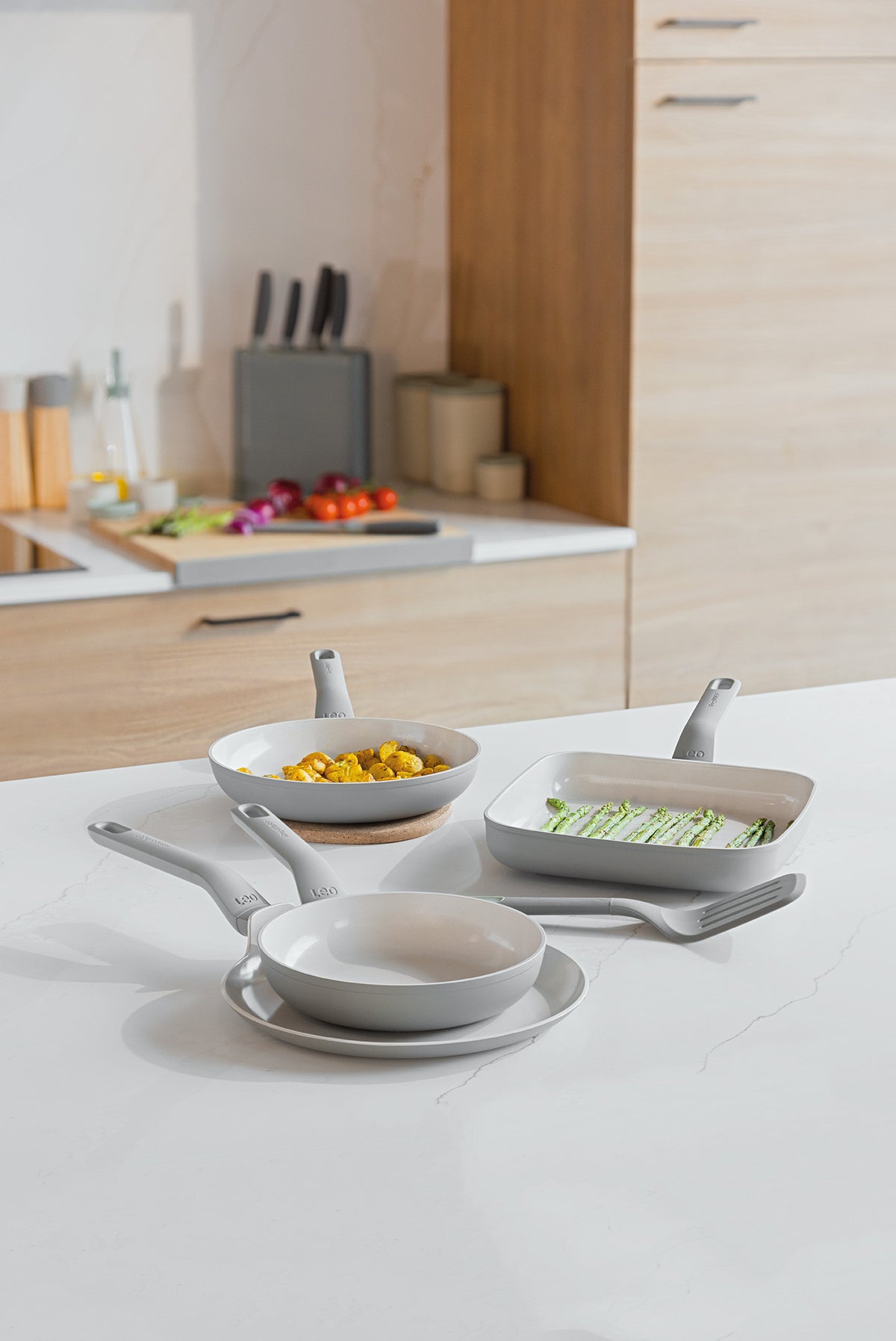 Nämä ihanteellisen kokoiset paistinpannut (20 cm ja 24 cm) auttavat sinua valmistamaan aamiaisen tai illallisen vaivattomasti. Tyylikäs 24 cm grillipannu on täydellinen ruskistamiseen, kun taas 26 cm lettupannu tekee makeiden tai suolaisten herkkujen paistamisesta helppoa. Kierrätetystä alumiinista valmistettu runko varmistaa nopean ja tasaisen lämmönjaon, ja terveellinen keraaminen tarttumaton pinnoite tarvitsee vain vähän tai ei lainkaan öljyä ja on erittäin helppo puhdistaa. Viileänä pysyvät kahvat lisäävät turvallisuutta ja mukavuutta, ja kaikki osat sopivat kaikille liesityypeille, myös induktiolle. Käytä yhdessä kierrätysmuovista valmistetun rei’itetyn lastan kanssa parhaan lopputuloksen saamiseksi.